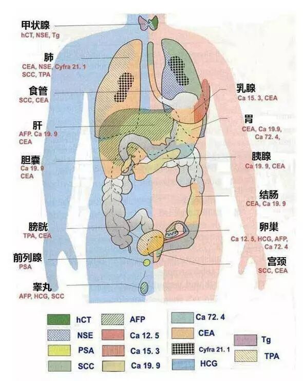 那么,各部位又有那些常用的肿瘤标志物呢?让我们看看下面这张教科书的老图