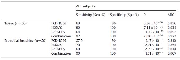 中山医院和中科院上海微系统与信息技术研究所对50例早期非小细胞肺癌(NSCLC)患者样本进行甲基化检测,结果显示RASSF1A单基因甲基化检测对癌组织的灵敏度为64%,对支气管刷检样本的灵敏度为60%。如果联合另两个基因共同检测(PCDHGB6、HOXA9),灵敏度会分别达到92%和80%[8]。