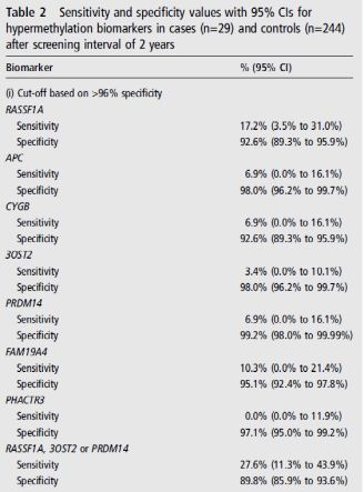 荷兰VUUniversity Medical Center对56例肺癌患者和219例对照的痰样本进行7个基因的甲基化检测(RASSF1A、APC、cytoglobin、3OST2、FAM19A4、PHACTR3、PRDM14),并对这些痰样本做了细胞学检测(细胞学结果全部为阴性)。结果显示痰样本的甲基化分子标志物仍需进一步筛选以获得更高的检测灵敏度[10]。